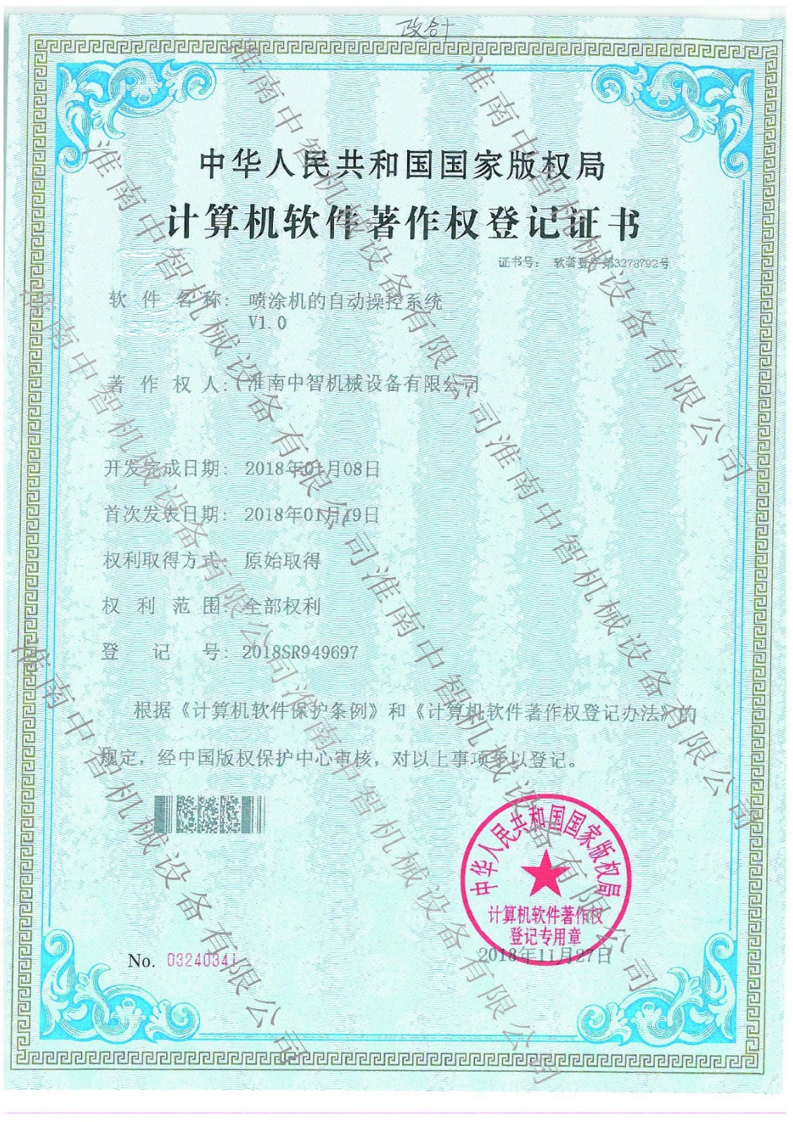 淮南乐玩体育机械喷涂机的自动操控系统专利证书